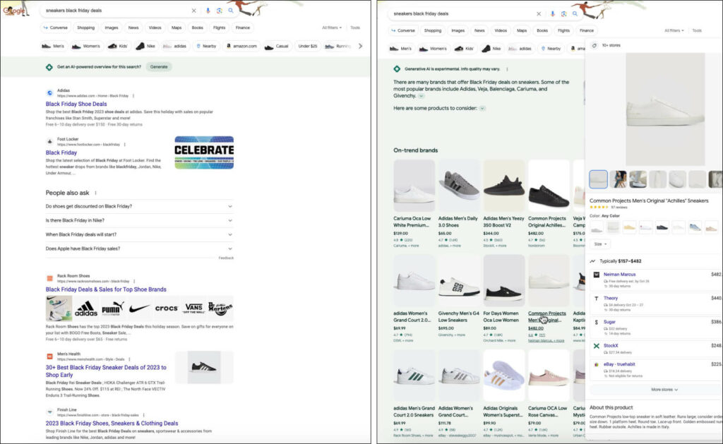 When searching for “laptop black friday deals” and “sneakers black friday deals” we get a similar type of highly blended traditional search results, with a mix of deals reviews guides for those product types, category pages of major retailers and even a product carousel in the case of laptops.